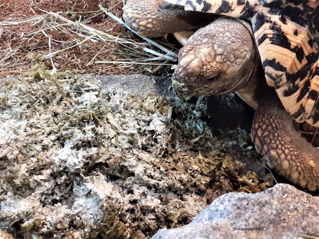 Skildpadden har behov for meget kalk, du kan også give dine landskildpadder evt. sepiaskaller og en kalkblok skildpadden selv kan gnave i.